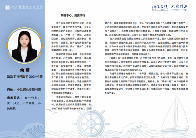为深入学习贯彻党的二十大精神,着力培养具有人文情怀的时代新人,进一步加强我院学生骨干队伍建设,3月25日至4月3日,学院举办了学生骨干素质能力提升系列活动。本次活动涵盖专题讲座、学习研讨等培训模块,旨在增强学生骨干的政治素养、业务能力和团队协作精神。