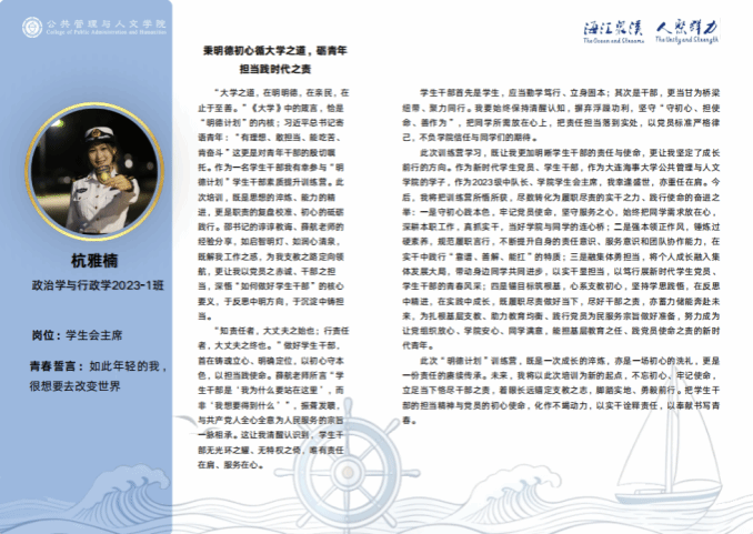 在开营仪式上,邵丽娜书记阐释“明德”内涵,提出三点希望:立鸿鹄志,做理想信念坚守者;练真本领,做知行合一实干家;怀赤子心,做服务同学贴心人。船舶与海洋工程学院薛航老师作《守初心 担使命 善作为——解锁优秀学生干部的成长密码》专题讲座,薛航老师结合一线案例,从初心使命、责任担当、方式方法三个维度强调学生干部要守住服务初心、敢于担当、讲究方法,在成就他人中实现自我成长。